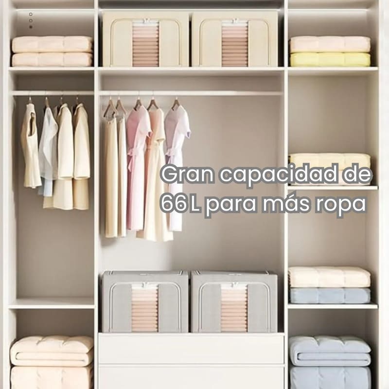 Con su gran capacidad de 66 litros, esta caja organizadora te permite guardar ropa, mantas y accesorios de forma ordenada y al alcance de la mano. Ideal para mantener tu placard impecable y aprovechar cada rincón del hogar.