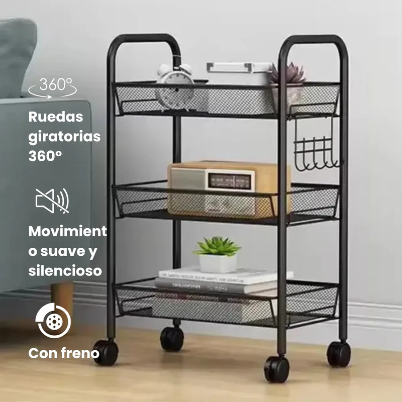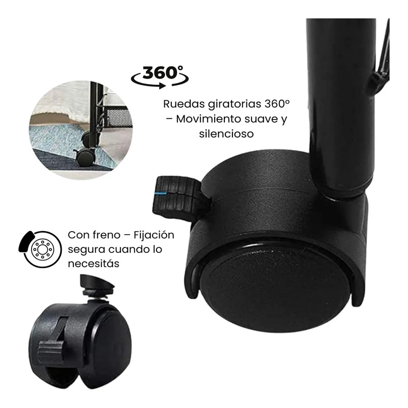 Las ruedas, fabricadas en PU silencioso, giran en todas direcciones para un desplazamiento suave incluso sobre superficies irregulares. Cuando necesites detenerte, basta activar el mecanismo de freno incluido en dos de las ruedas, garantizando que el carro permanezca firme donde lo dejaste.