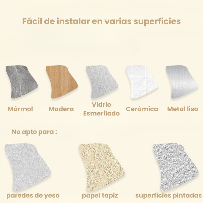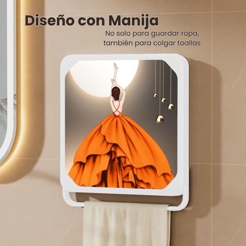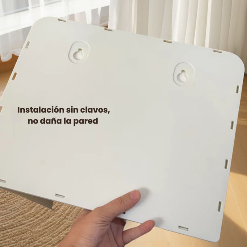 Colgar el organizador. Enganchá el cuerpo del mueble en la base pegada aprovechando las ranuras tipo ojal de la parte trasera. Verificá que quede firme y alineado.