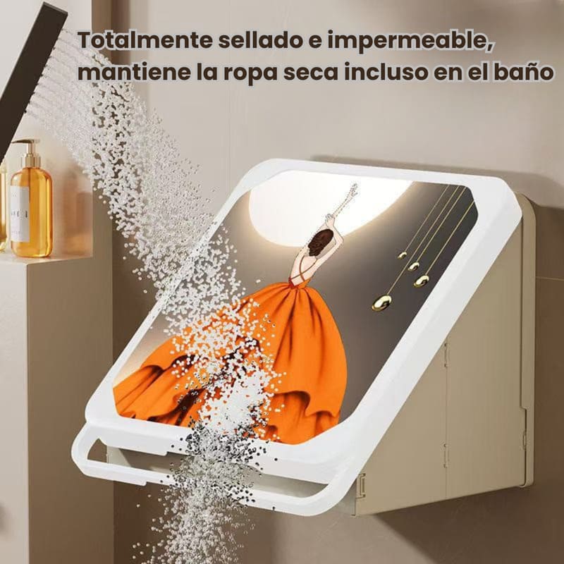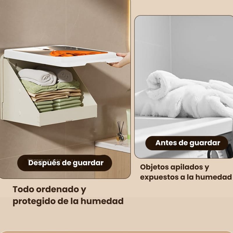 Plegable ahorra espacio: cerrado ocupa poco y luce como un cuadro; abierto ofrece un cajón profundo para apilar toallas, paños o ropa.