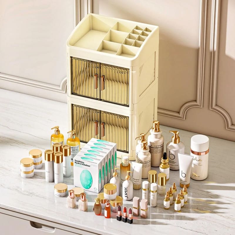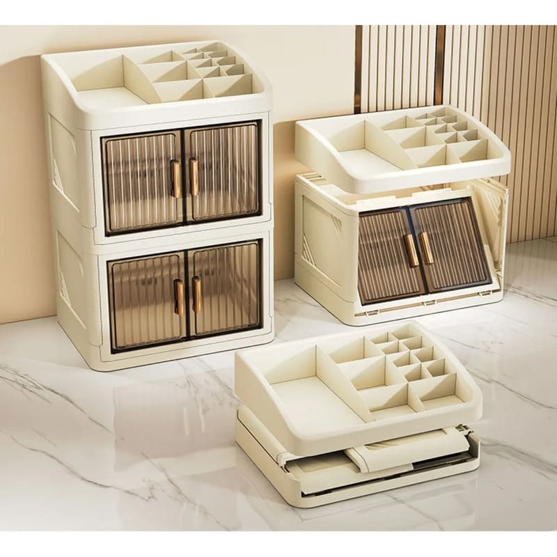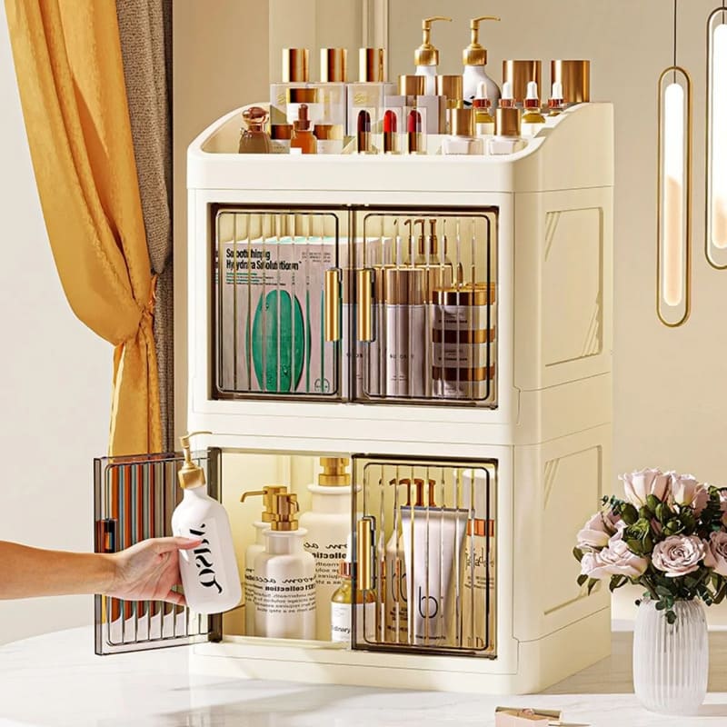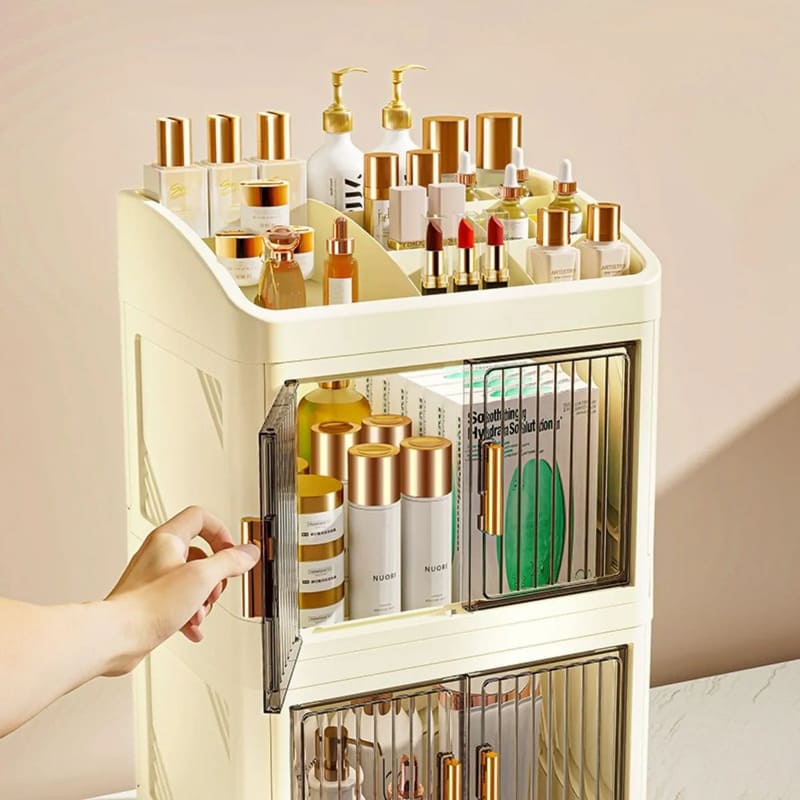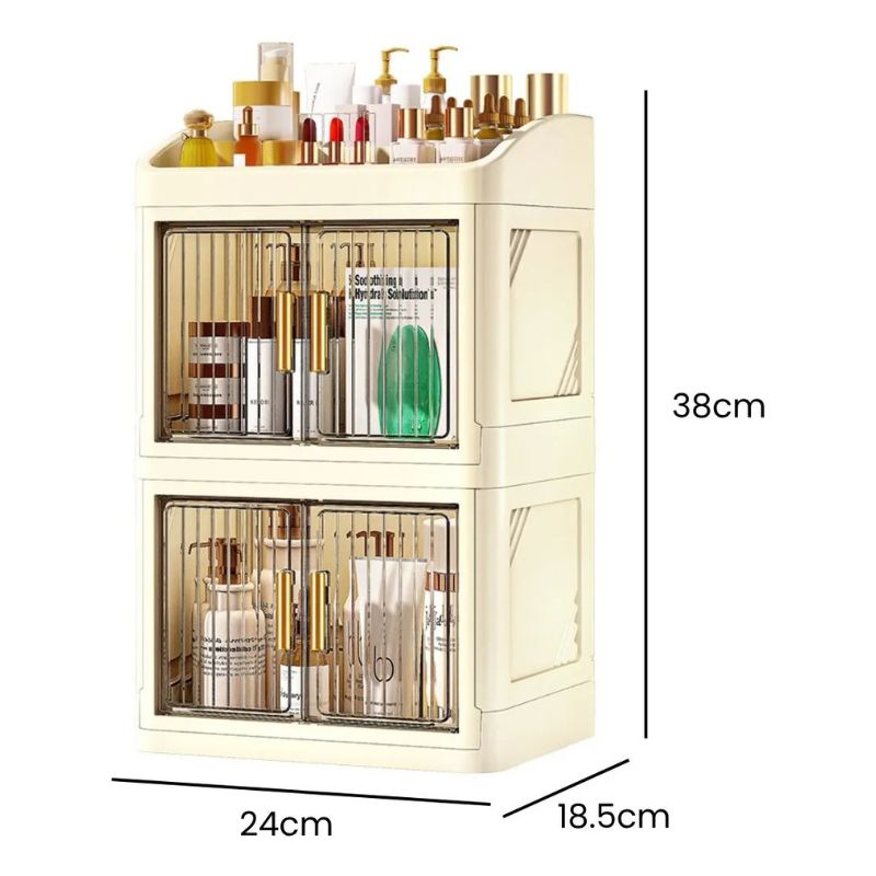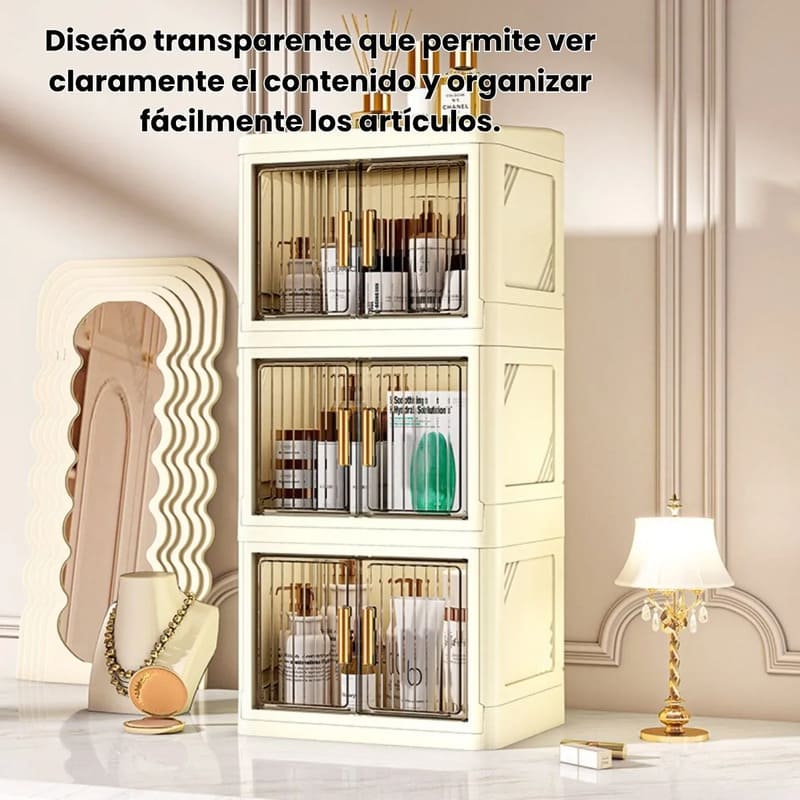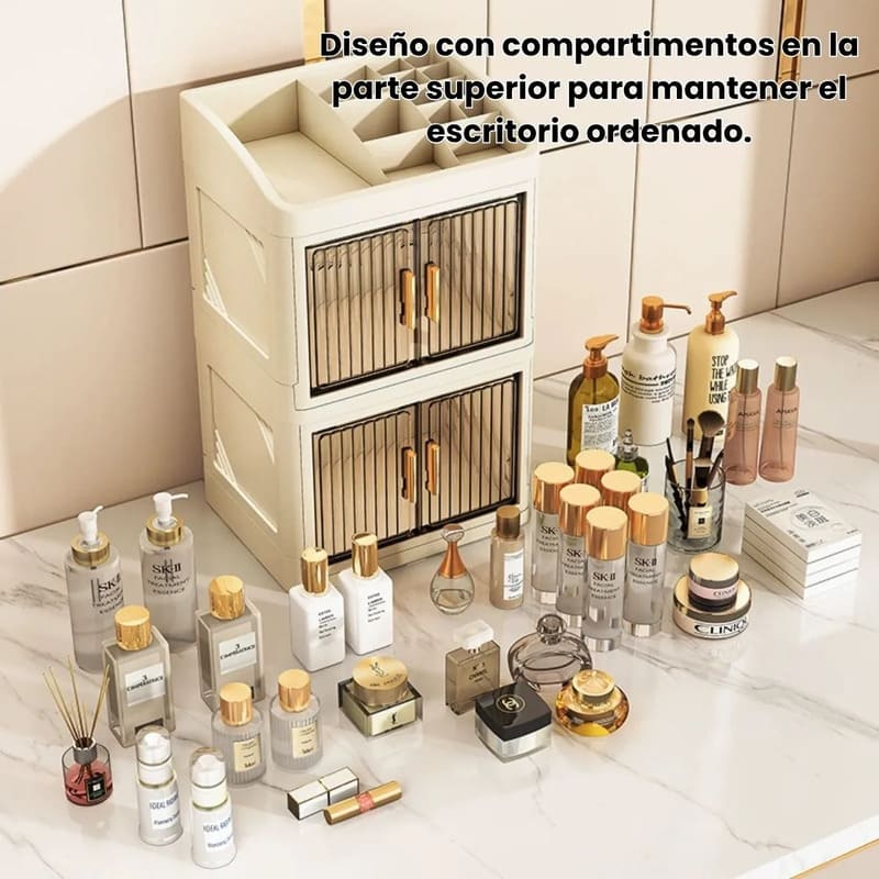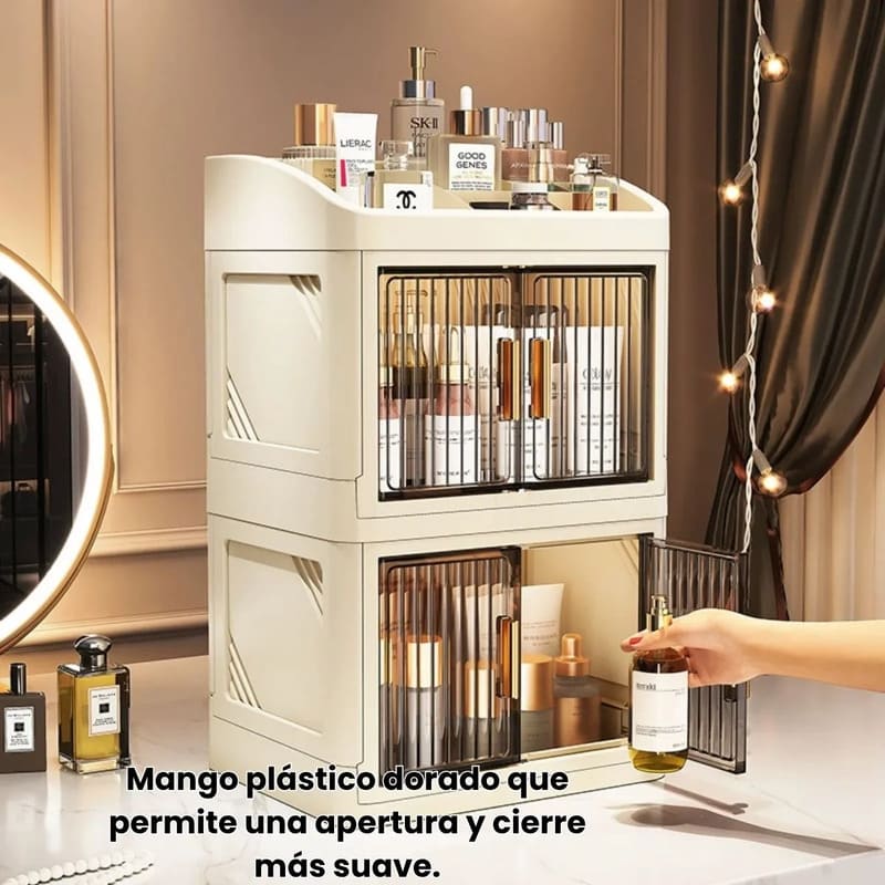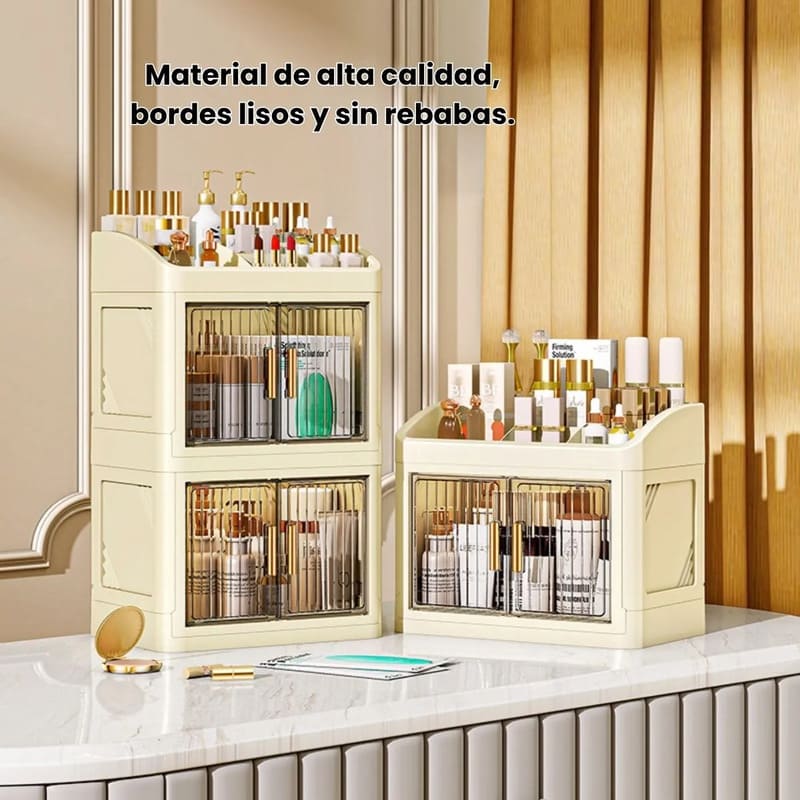 Fabricado en plástico PP resistente, este organizador mantiene tus productos seguros y libres de polvo gracias a su sistema de doble puerta con cierre firme y duradero.