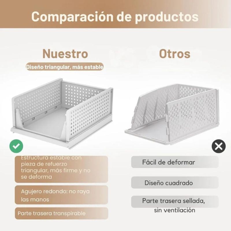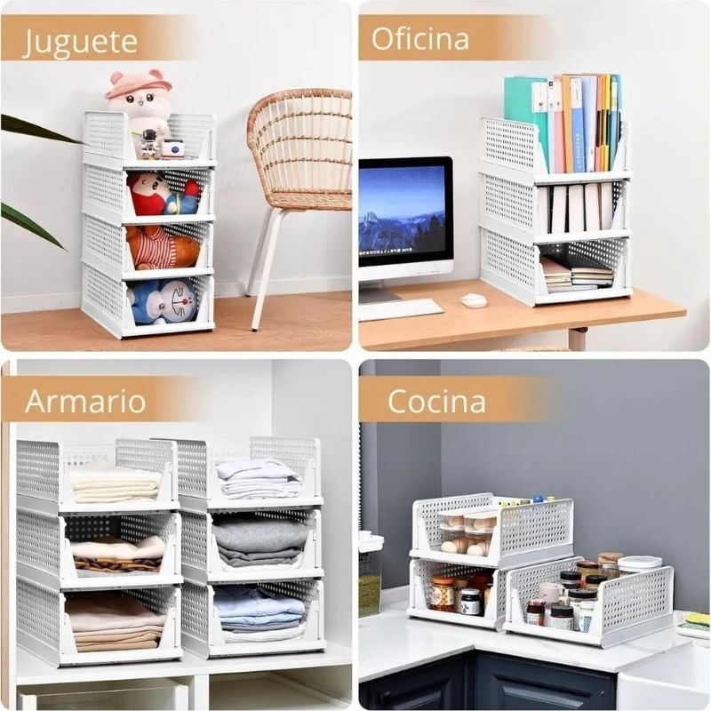 Estos organizadores ofrecen una solución funcional para guardar más en menos espacio. Su estructura plegable permite armarlos o guardarlos fácilmente cuando no los necesitás, adaptándose a tus rutinas y cambios de temporada.